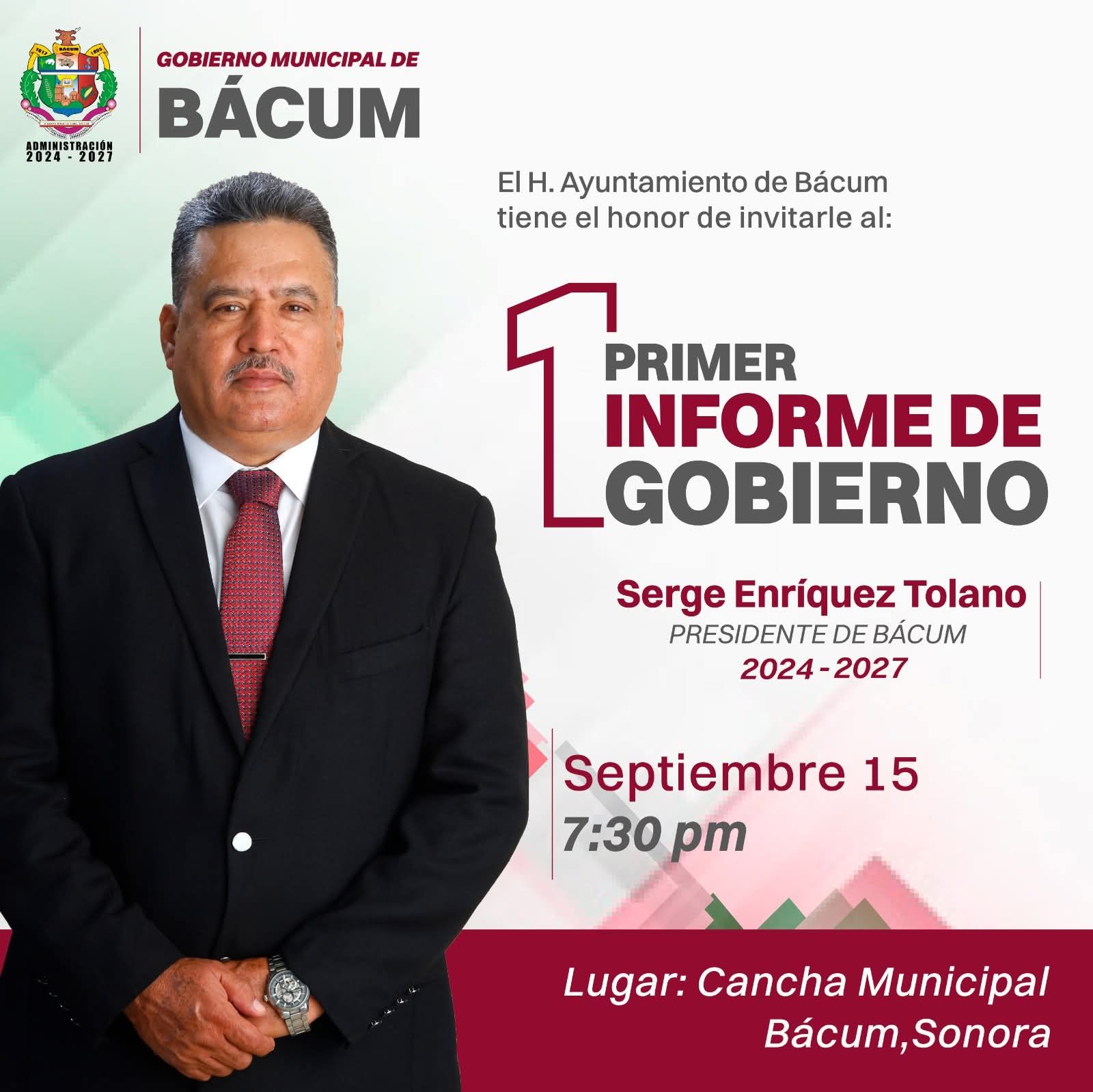 El H. Ayuntamiento de Bácum que preside Serge Enríquez Tolano tiene el honor de extenderle una cordial invitación a toda la comunidad bacumense a que sea testigo del Primer Informe de Gobierno de la administración municipal 2024-2027, así como del tradicional Grito de Independencia.